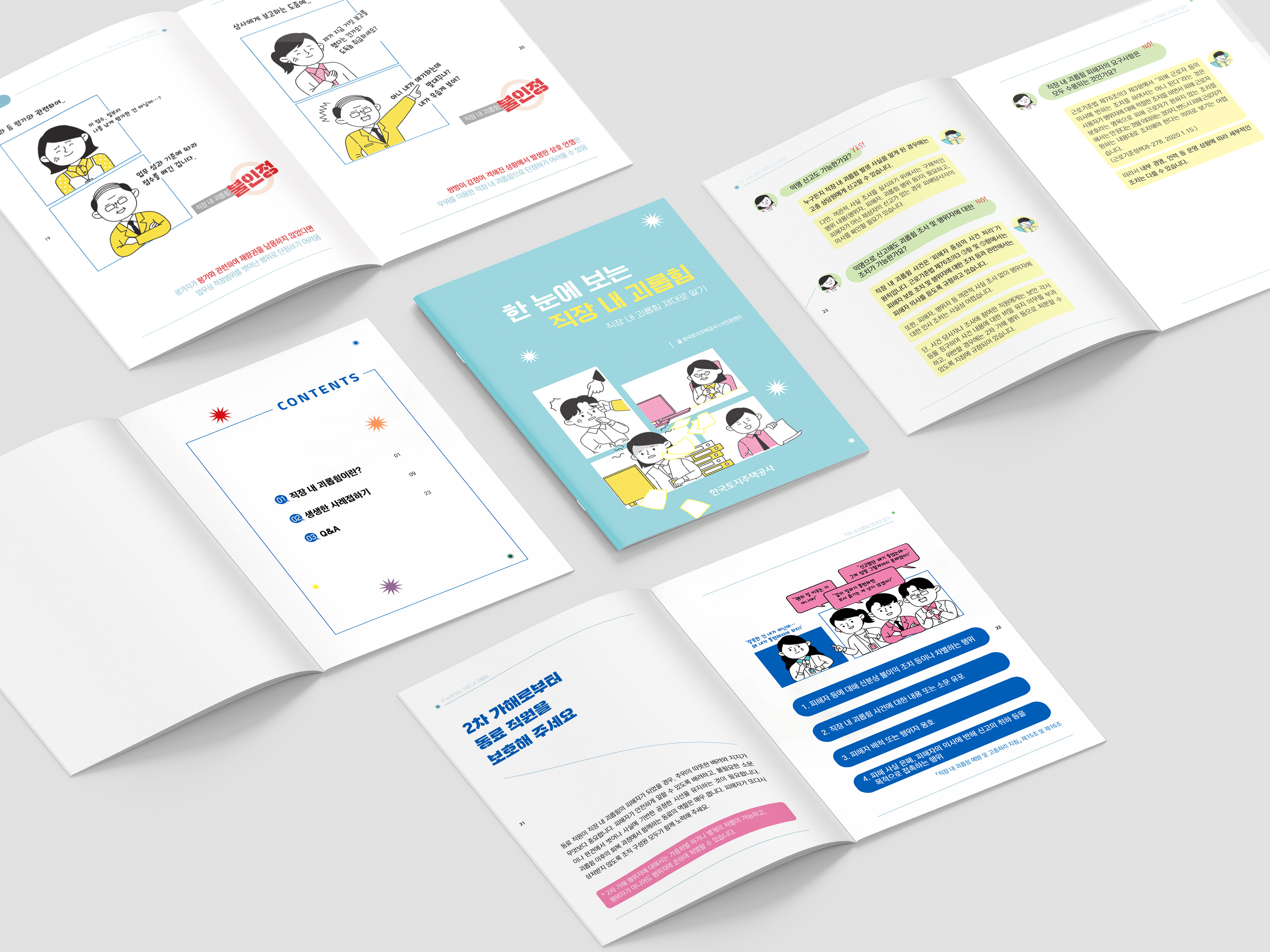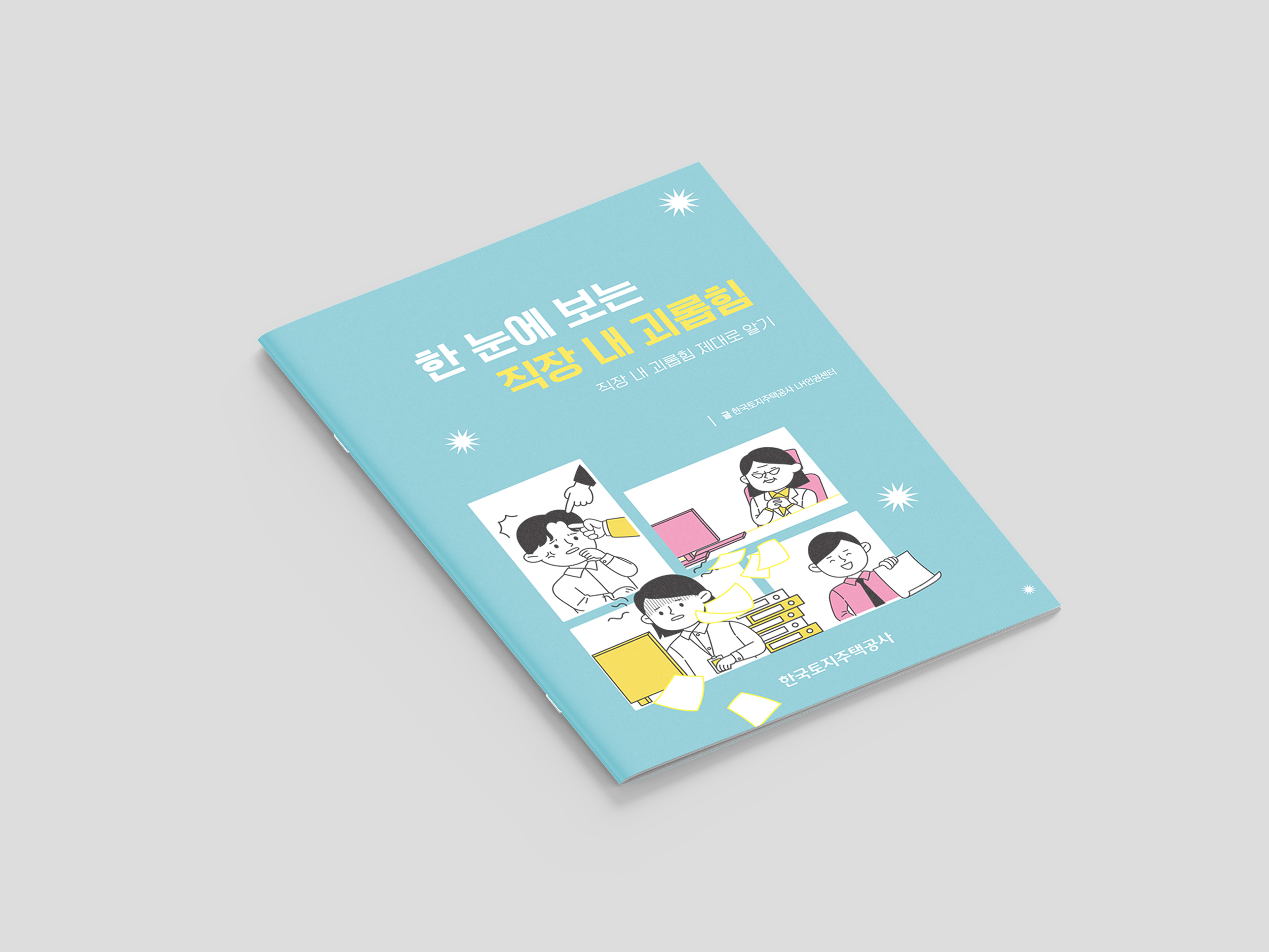 이 작업은 한국토지주택공사(LH) 내 인권센터의 의뢰로 제작된 직장 내 괴롭힘 예방 안내책자로, 실제 사례를 중심으로 시각적 이해도를 높이기 위한 만화 형식으로 기획·디자인한 프로젝트입니다.