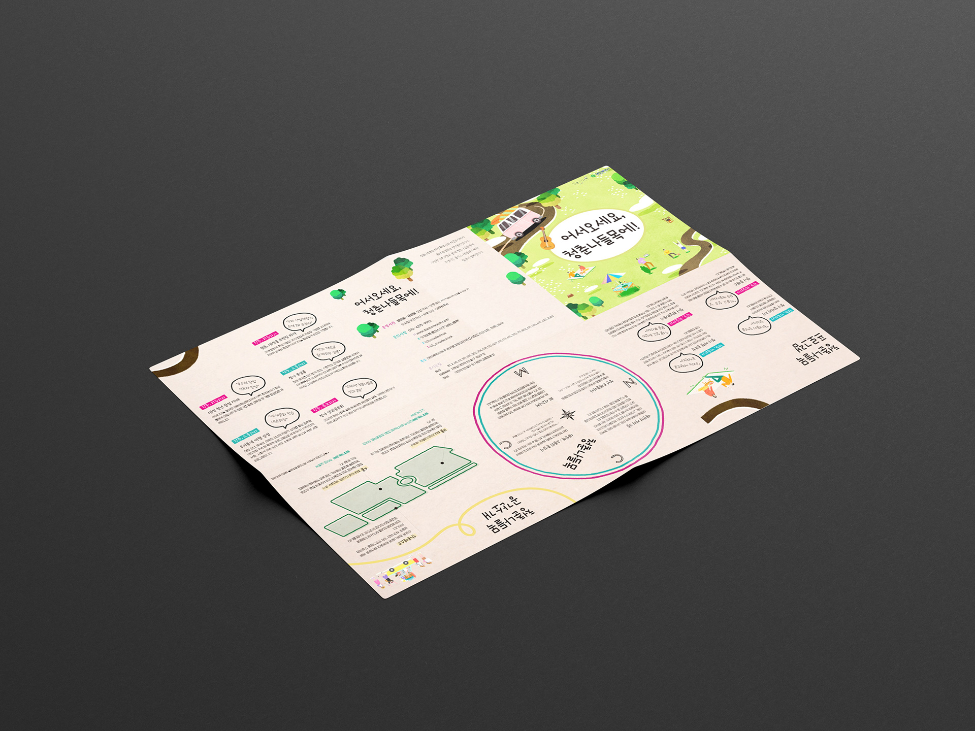 한쪽 면에는 청춘나들목의 운영 정보와 참여 프로그램을 톡톡 튀는 일러스트와 말풍선 구성으로 친근하게 안내하고,
