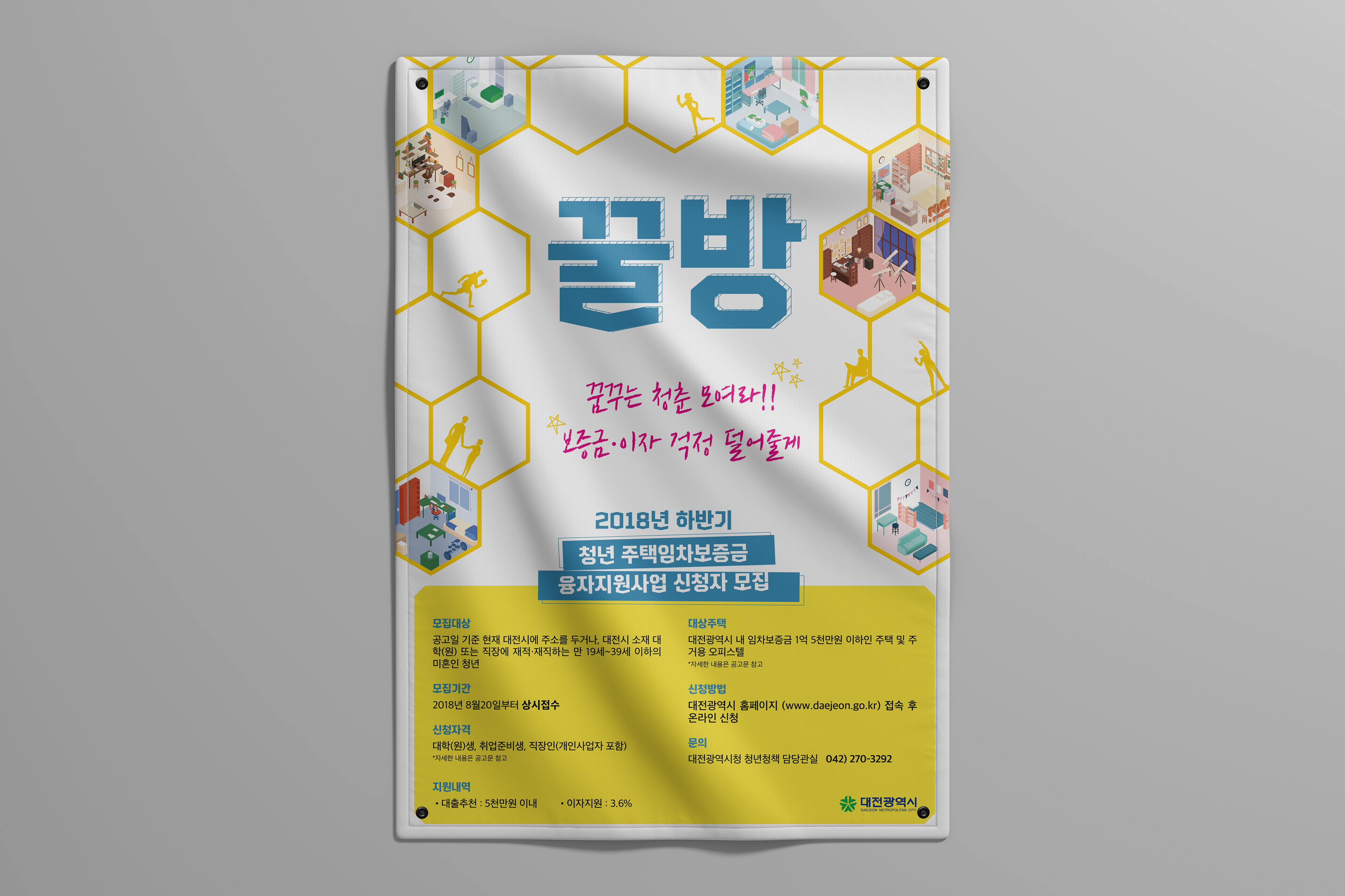 이 포스터는 대전광역시에서 진행하는 청년 주거지원사업 ‘꿀방’의 신청자 모집을 알리기 위한 홍보물로, ‘벌집’과 ‘꿈꾸는 방’을 콘셉트로 기획한 디자인입니다.