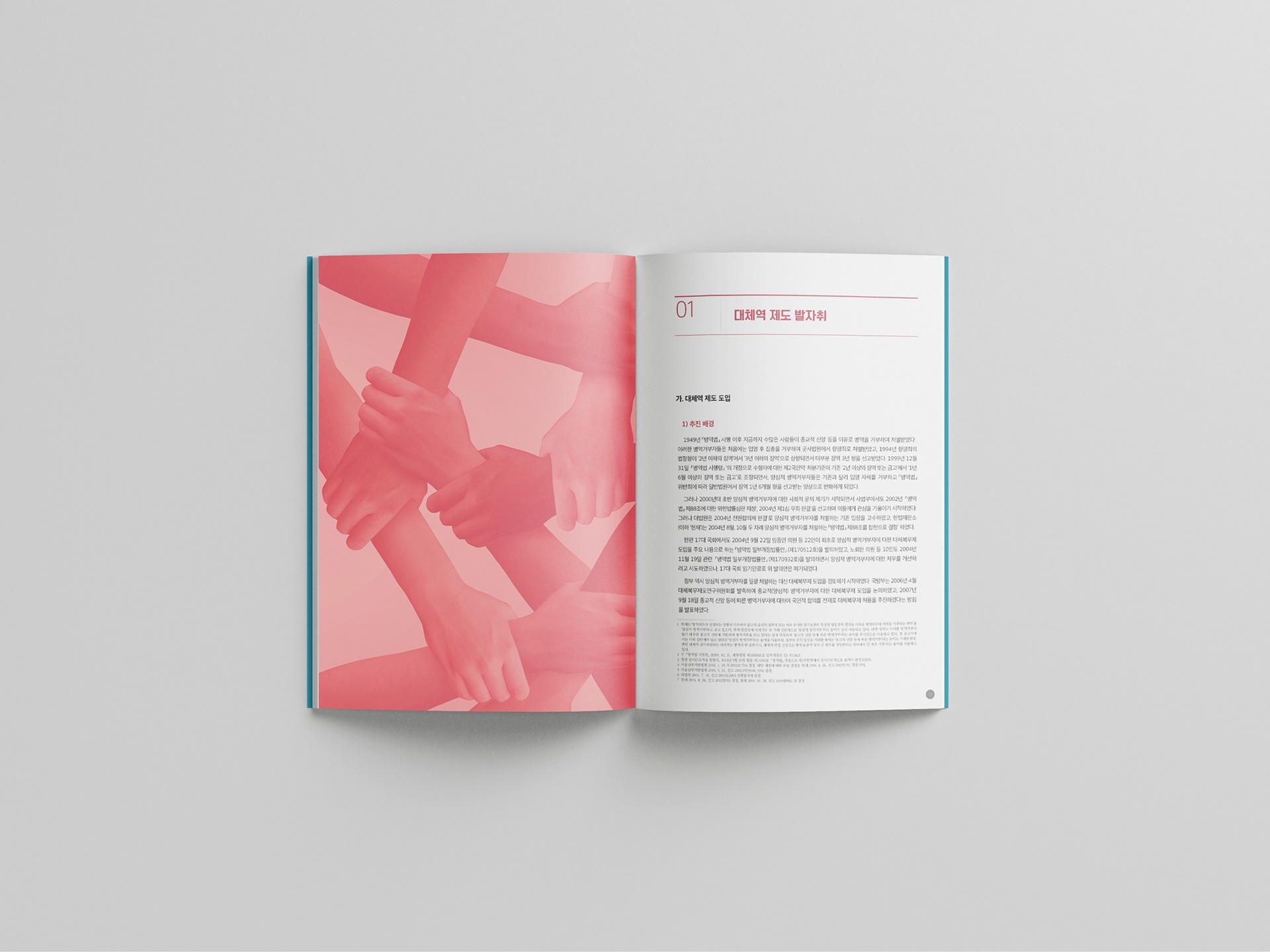 표지에는 다양한 색감과 텍스처를 가진 오브제를 배치하고, 사람들이 손을 맞잡은 이미지를 내지의 오프닝에 사용해 서로를 감싸는 상징적 메시지를 전달했습니다.